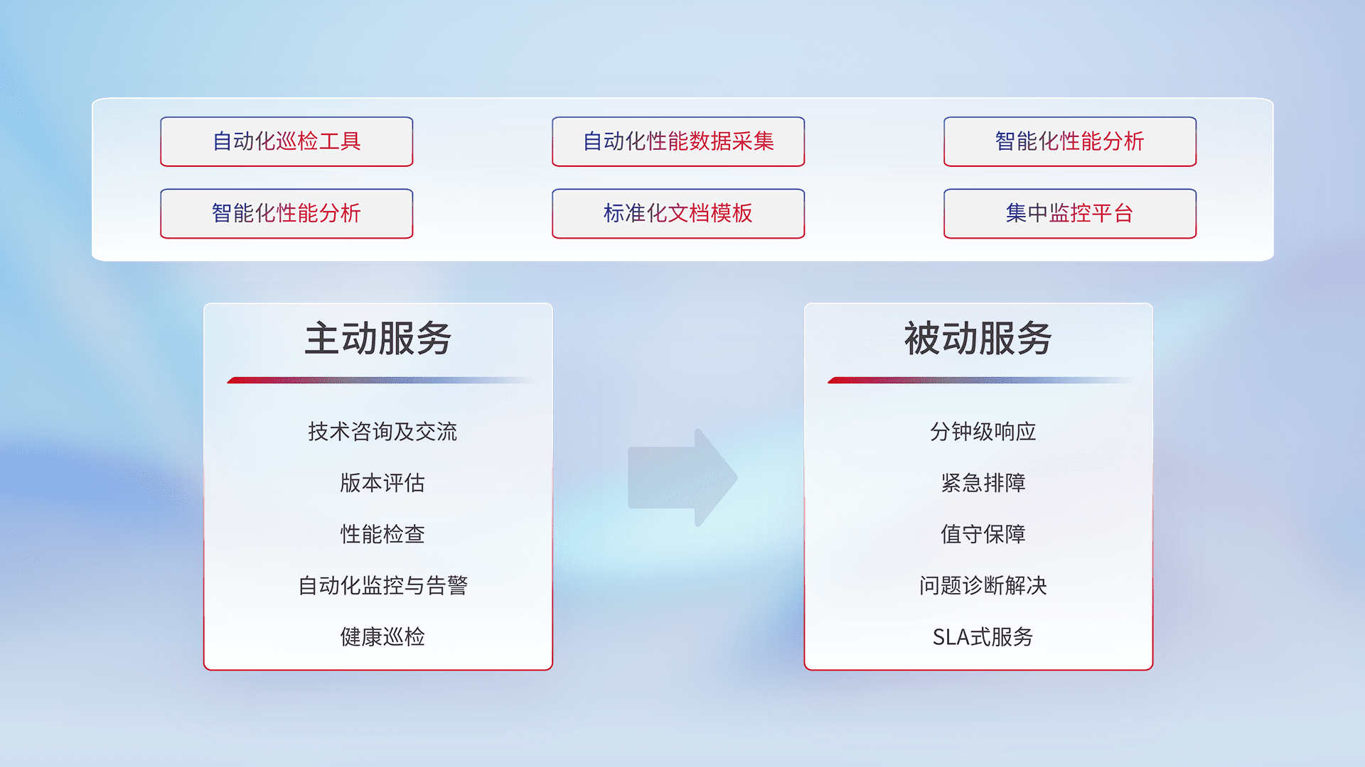 智能化工具和标准化文档,,,,保障服务质量,,,,提供主动服务(包含技术咨询、、、、版本评估、、性能检查、、自动化监控与告警、、健康巡检)和被动服务包含(分钟级响应、、、、紧急排障、、值守保障、、问题诊断解决、、、SLA服务)。。
